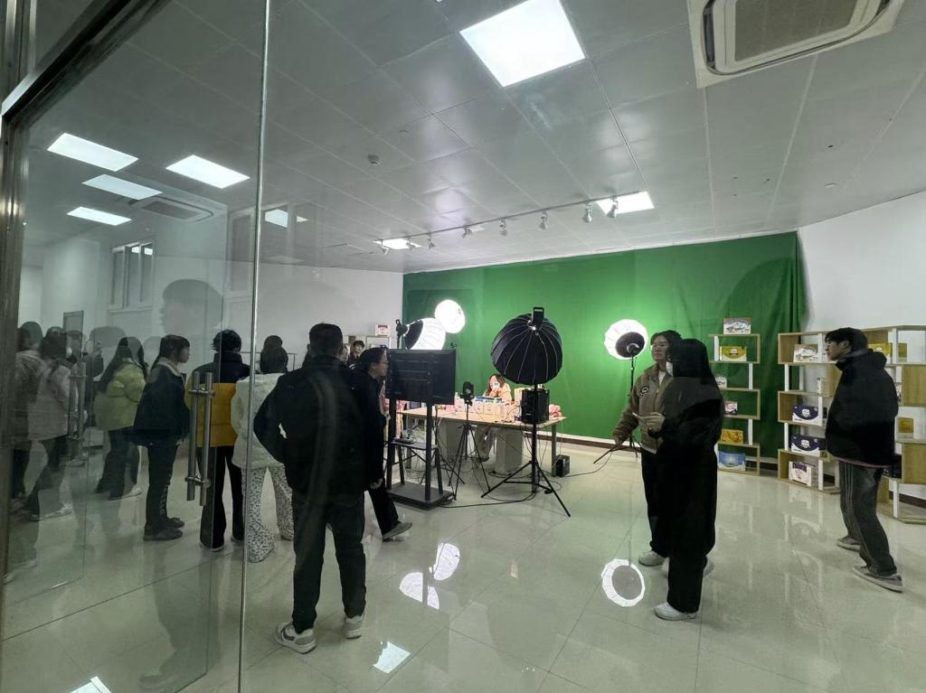 学生们不仅观看了直播设备、现代化的拍摄间和琳琅满目的商品展示台,还通过工作人员的讲解,了解了直播背后的技术支持和运营策略。此外,学生们还进行了模拟销售,周玉负责人对学生进行现场指导。