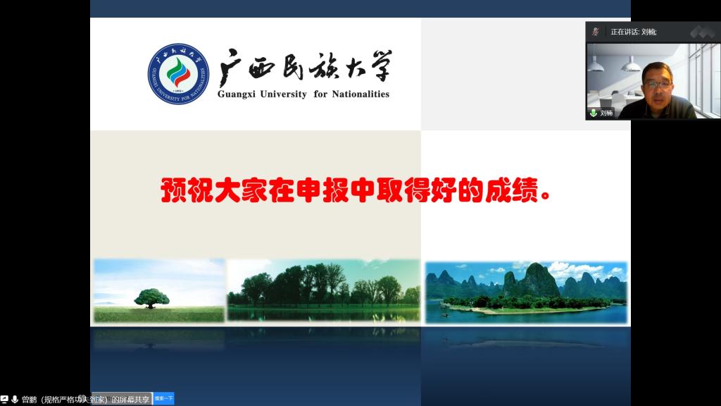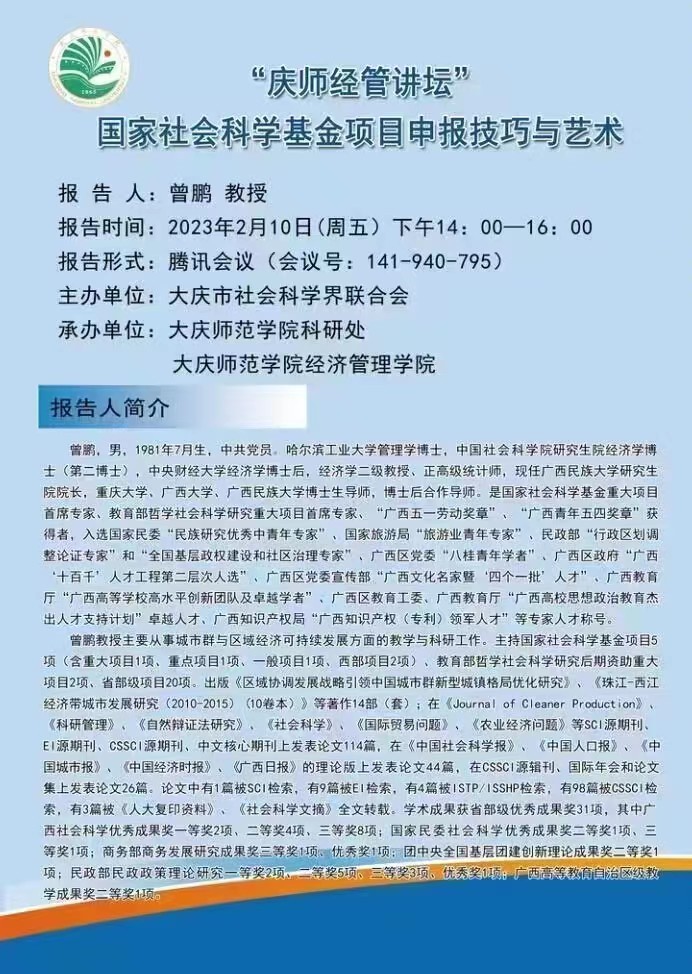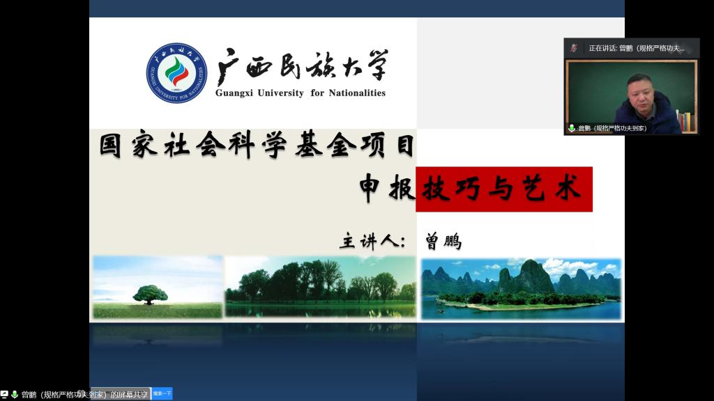 2月10日下午,广西民族大学研究生院院长,重庆大学、广西大学、广西民族大学博士生导师、博士后合作导师曾鹏教授受邀做了题为《国家社会科学基金项目申报技巧与艺术》的专题讲座。讲座采用线上腾讯会议形式,由bv伟德国际1946行政负责人刘楠教授主持,科研处领导、部分文科学院院长、科研副院长、教师以及经管学院全体教师等200余人参会。