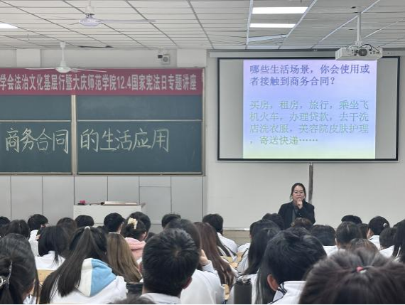 之后,秦老师结合bv伟德国际1946专业特征,以商务合同的生活应用为主题,为同学们从商务合同概述与法律基础、商务合同结构与分类、商务合同生活应用等几个方面讲解了商务合同的相关知识。并结合真实案例,让bv伟德国际1946的同学们对合同都有了深刻的了解,并知晓商务合同在生活中的应用,如:房屋租赁合同、出境旅游合同等注意事项,让学生们了解宪法,遵守宪法,维护宪法权威,树立法律意识,做到学法、守法、知法、懂法。