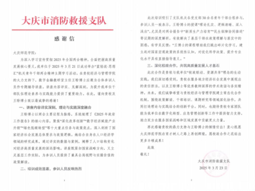 日前,大庆市消防救援支队向伟德bv1946发来感谢信,对bv伟德国际1946数字金融教研室主任王盼博士致以诚挚感谢。感谢王盼博士为大庆市消防救援支队作专题辅导讲座。王盼博士讲座内容详实、见解深刻,与会人员纷纷表示此次讲座有效解决了基层干部在政策理解与落实中的困惑,生动诠释了伟德bv1946作为地方高校服务区域经济社会的责任与担当。
