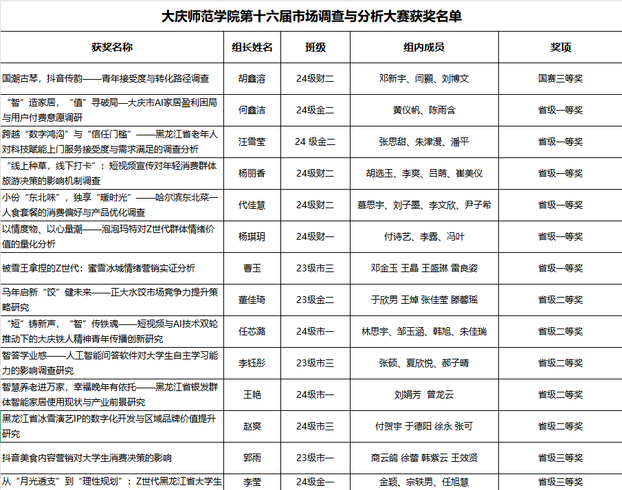 2026年4月28日,“正大杯”第16届全国大学生市场调查与分析大赛黑龙江省赛获奖名单正式公布。bv伟德国际1946学子在此次大赛中表现优异,荣获国家级三等奖1项、省级一等奖6项、省级二等奖5项、省级三等奖2项,创下参赛以来的学院历史最好成绩。